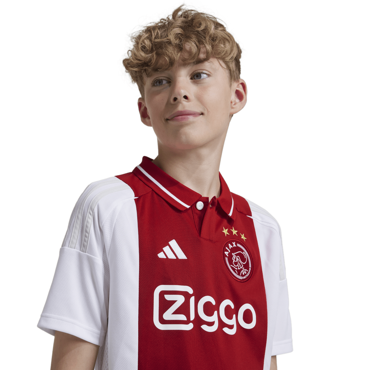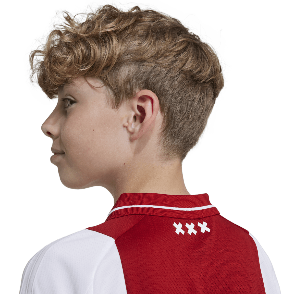 A tribute to one of the club's most dominant eras. This juniors' adidas Ajax Amsterdam home jersey takes inspiration for its clean, classic look from an invincible '90s season. Tonal 3-Stripes on the shoulders shift all the focus onto that red polo collar, iconic central stripe and woven club badge. Moisture-managing AEROREADY ensures players and fans enjoy their football in comfort.This product is made with 100% recycled materials. By reusing materials that have already been created, we help to reduce waste and our reliance on finite resources and reduce the footprint of the products we make.