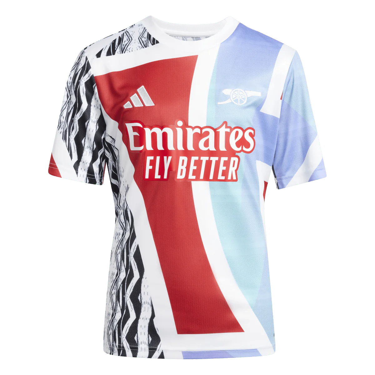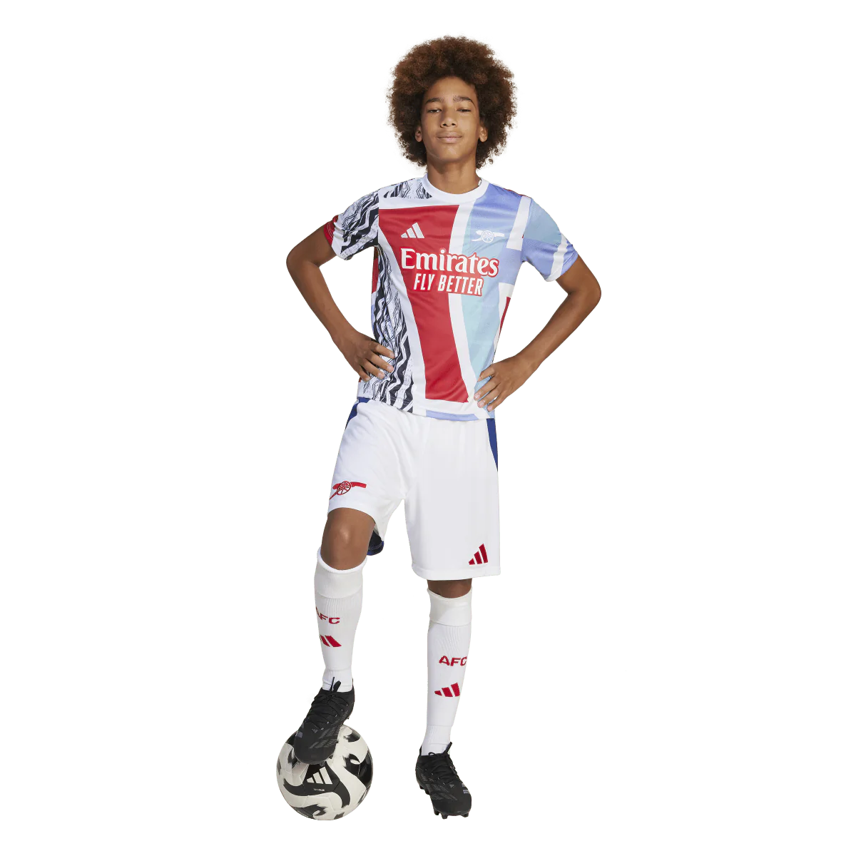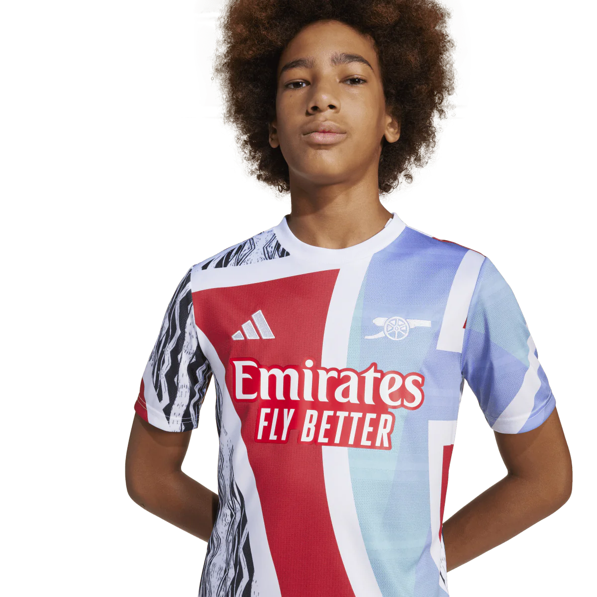 Using elements from Arsenal's 24/25 home, away and third shirts, adidas created this pre-match jersey to help you stand out from the football crowd. A juniors' version of the tops players wear as they warm up before kick-off, it will keep you comfortable with soft fabric and moisture-managing AEROREADY. An embroidered team badge completes the bold look. This product is made with 100% recycled materials. By reusing materials that have already been created, we help to reduce waste and our reliance on finite resources and reduce the footprint of the products we make.