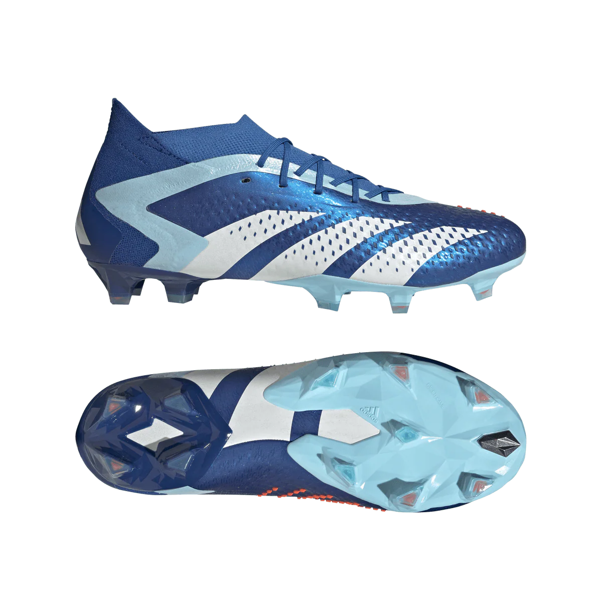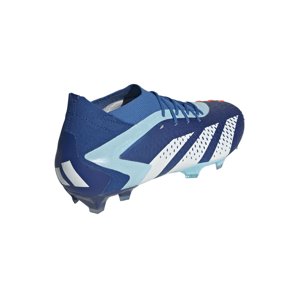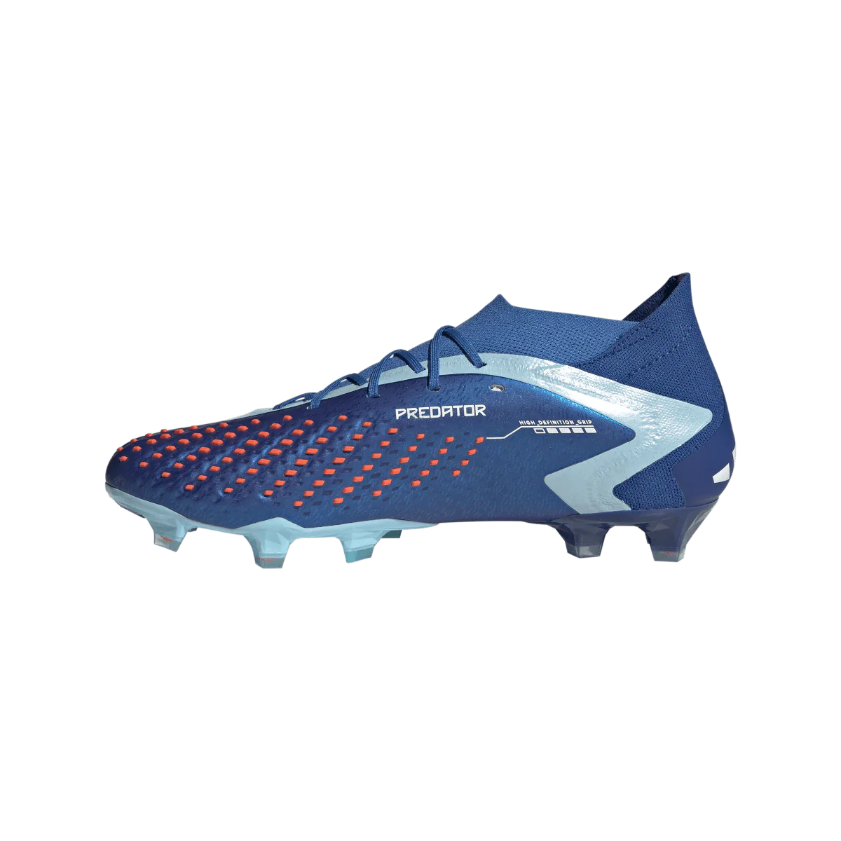 Top corner. Bottom corner. All the corners. adidas Predator Accuracy is crafted for goalscoring, so you know the ball will find the net. The fun's in choosing how it gets there. These firm ground soccer cleats have a soft HybridTouch upper with High Definition Grip rubber elements that deliver biting grip on the ball without compromising forefoot flexibility. A Power Facet in the split outsole supercharges strikes. Made with a series of recycled materials, this upper features at least 50% recycled content. This product represents just one of our solutions to help end plastic waste.