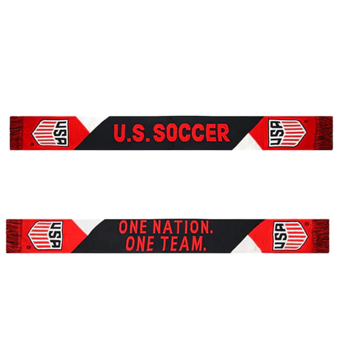 Let everyone know who you think is the greatest football club in the world when you raise your official licensed U.S. Soccer "One Nation. One Team." reversible fan scarf. Features the U.S. Soccer Federation logo and name in woven acrylic in red, white and blue colors inverted on each side. Dimensions: 58" x 6.5"