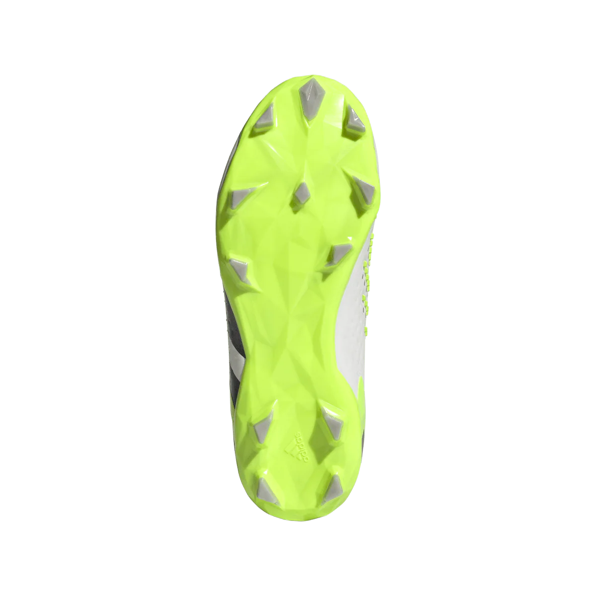 Top corner. Bottom corner. All the corners. adidas Predator Accuracy is crafted for goalscoring, so you know the ball will find the net. The fun's in choosing how it gets there. These juniors' soccer cleats have a soft HybridTouch upper with High Definition Grip rubber elements that deliver biting grip on the ball without compromising forefoot flexibility. A specialist outsole keeps you in control on dry grass pitches. Made with a series of recycled materials, this upper features at least 50% recycled content. This product represents just one of our solutions to help end plastic waste.
