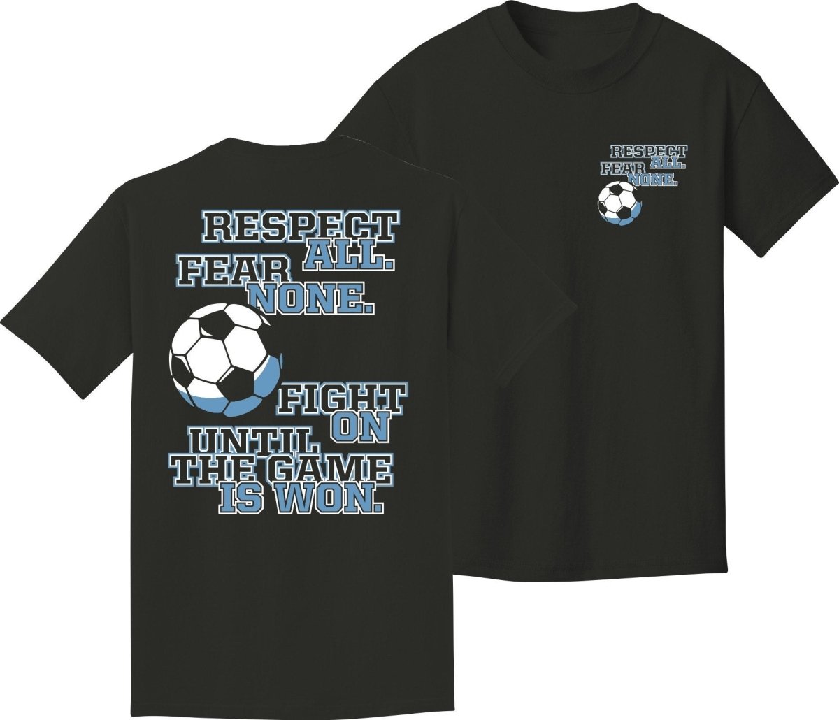 Four11's "Fear None" short-sleeve soccer t-shirt can simply be every competitive player's mantra. Every word conveys a powerful sense of sportsmanship that gives honor to the essence of soccer. The front-facing logo can be seen as a token to competitors, a call for arms, a measure of a player's resolve. But little do they know, that the shirt is not just about the players. When they see the back print, they'll know your motivation, your drive and passion. Fight on, until the game is won. What a resounding exclamation of chivalry. With the design made of high-quality screen prints, and the fresh color of the fabric, your message is sent across with clarity. Top that with comfort from 100% cotton, along with hems and seams that exude strength, your statement shirt will bring power to the game.