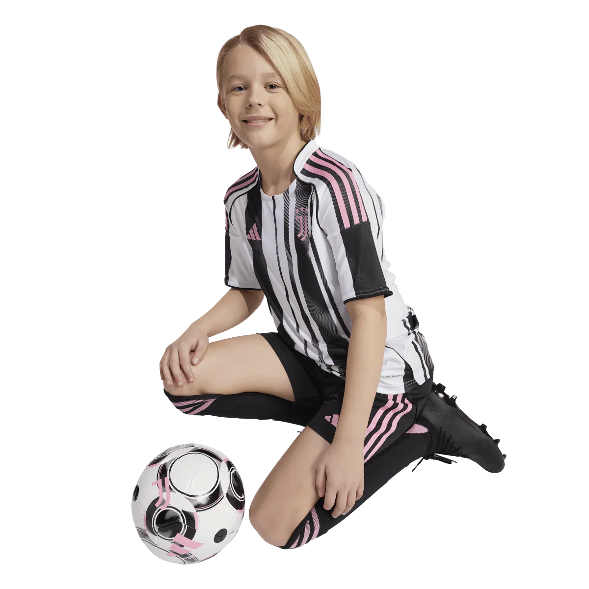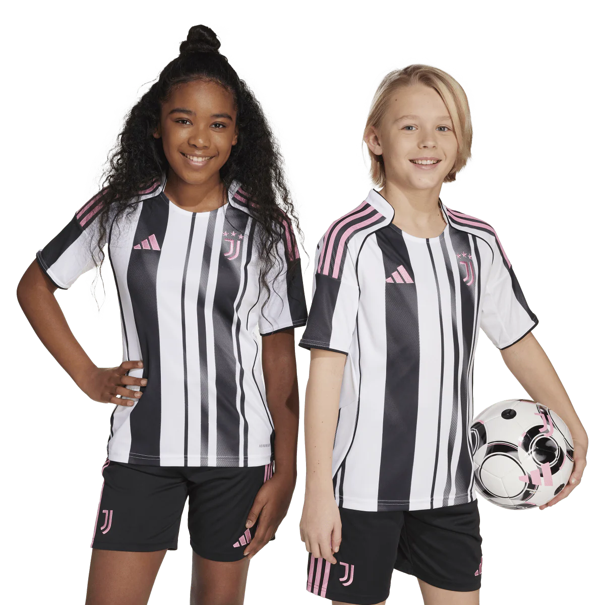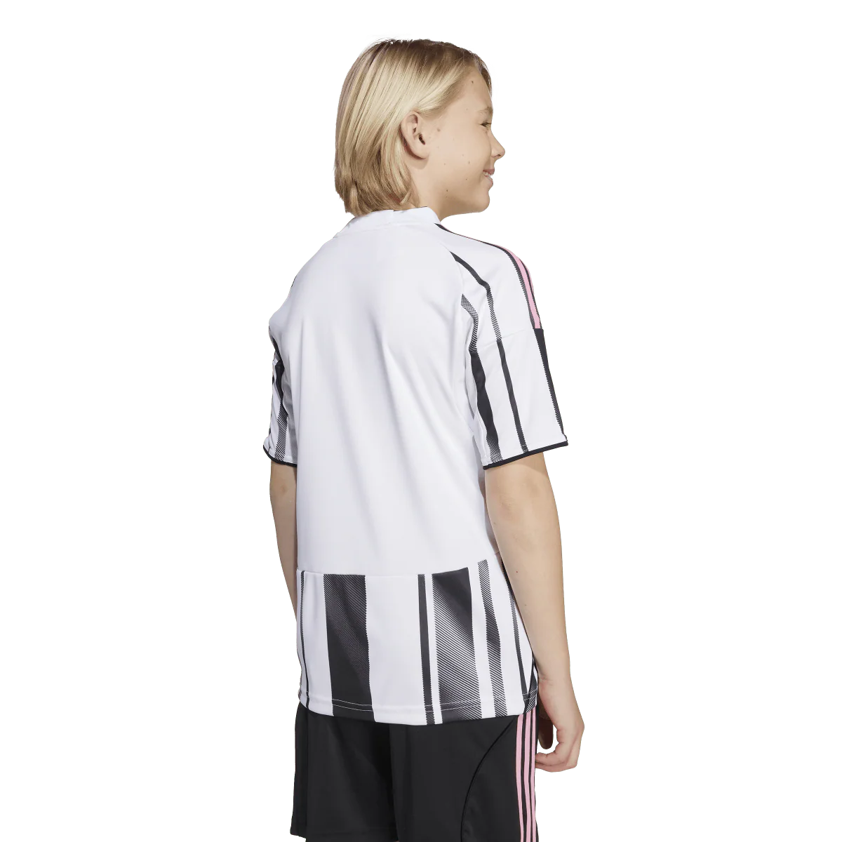 Football tradition with a twist. This adidas Juventus home jersey plays with the club's famous stripes to produce a design that really catches the eye. Created to keep young fans comfortable, this juniors' version teams moisture-managing AEROREADY with smooth interlock fabric. Finished in the club's timeless pink colours, an embroidered badge flashes your fandom.