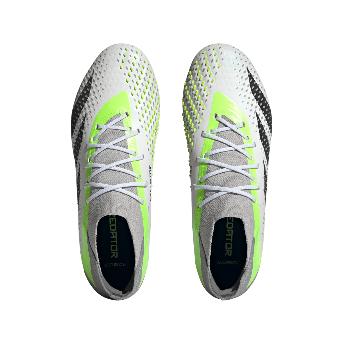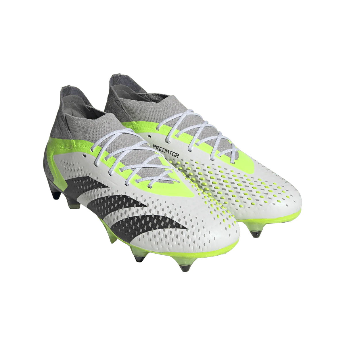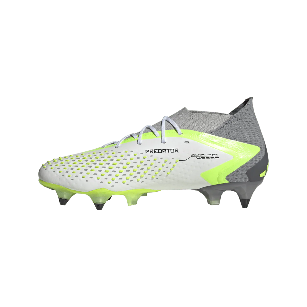 Top corner. Bottom corner. All the corners. adidas Predator Accuracy is crafted for goalscoring, so you know the ball will find the net. The fun's in choosing how it gets there. These soft ground soccer cleats have a soft HybridTouch upper with High Definition Grip rubber elements that deliver biting grip on the ball without compromising forefoot flexibility. A Power Facet in the split outsole supercharges strikes. Made with a series of recycled materials, this upper features at least 50% recycled content. This product represents just one of our solutions to help end plastic waste.