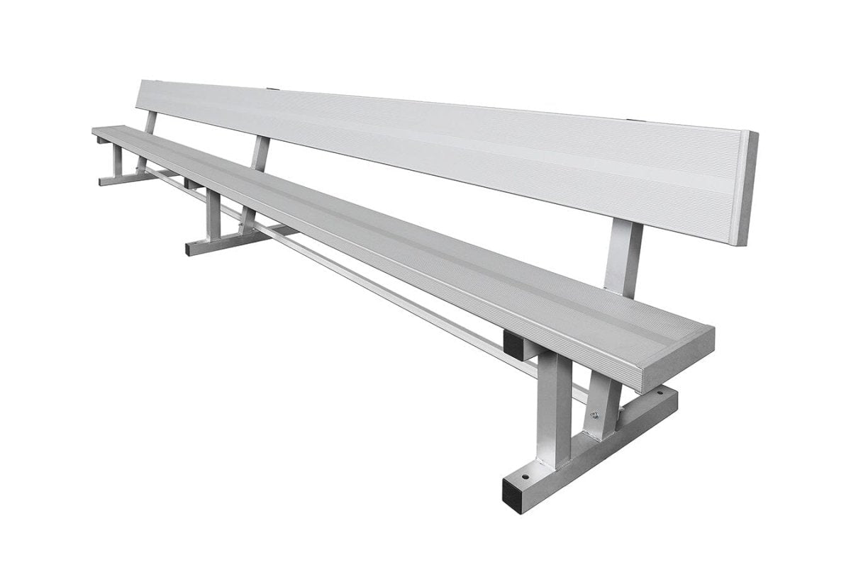 The 9B2 Benches with Back are all-aluminum benches. The Benches with Back are available in three sizes (6', 15', 21'). The planks of the 9B2 Benches with Back are clear anodized and are 10" wide.
