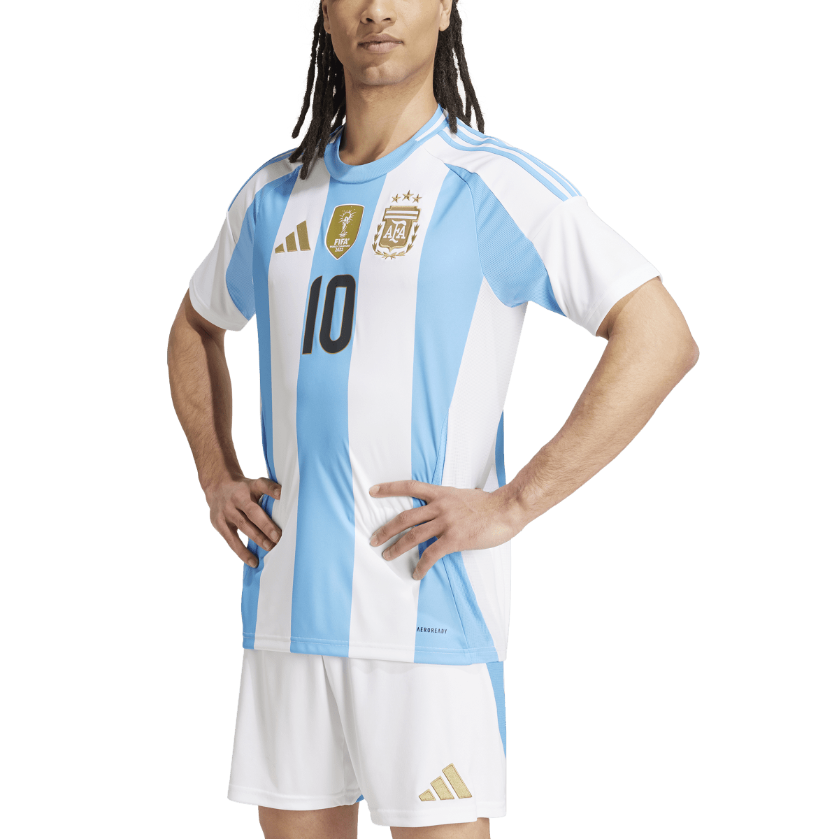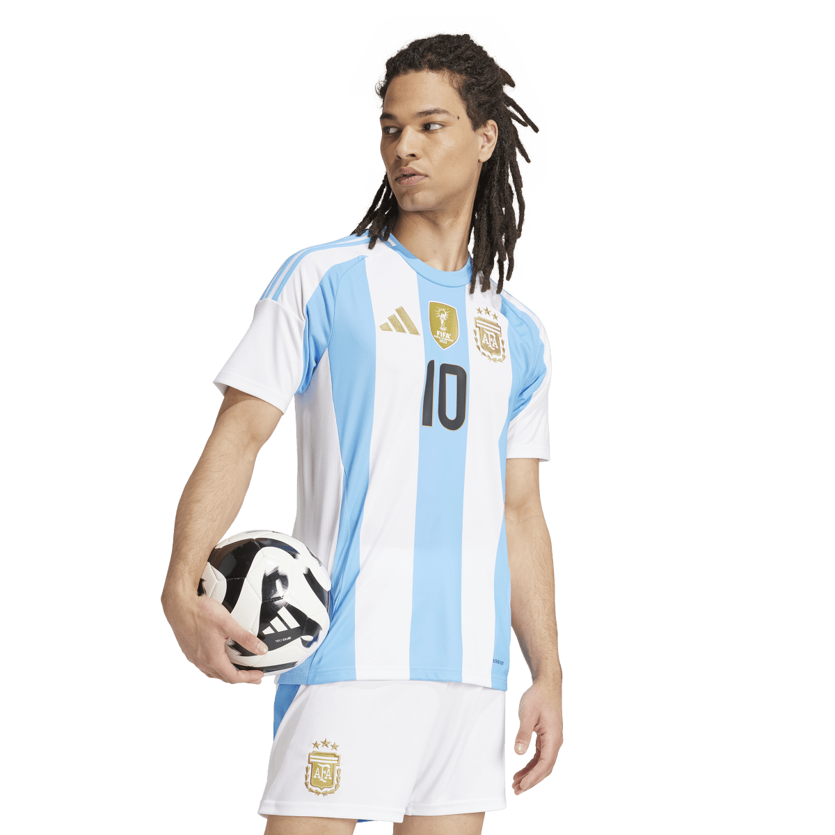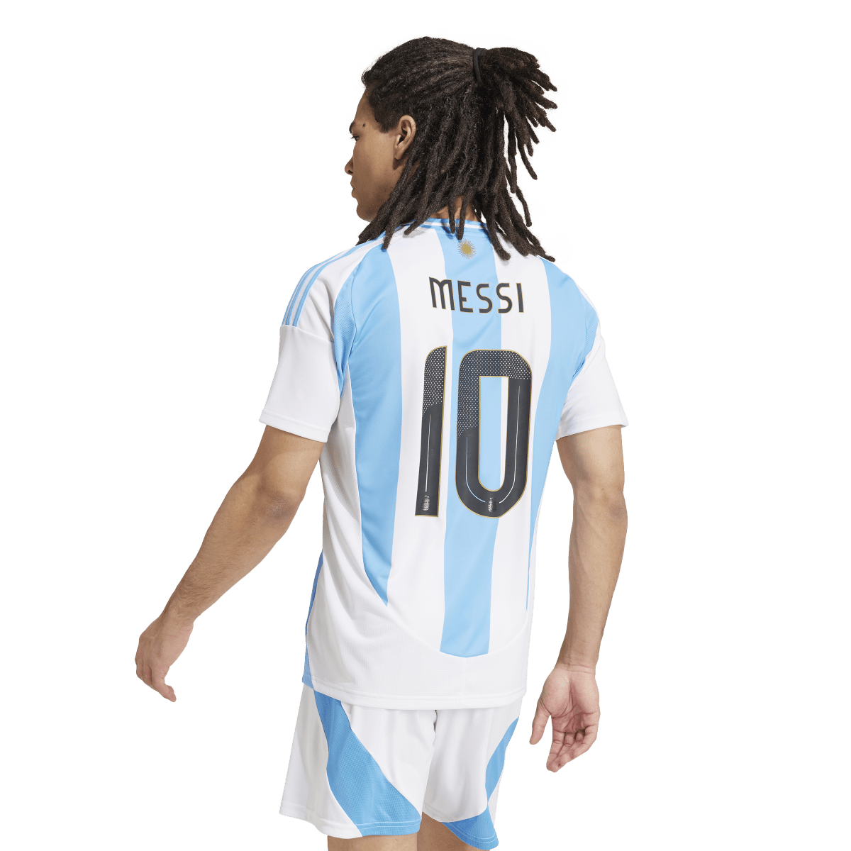 A classic look for the world champions. From those famous stripes to its Sun of May sign-off, this adidas football shirt rewards loyal fans with all the elements you'd want to see in a traditional Argentina home jersey. Those gold accents and three stars are extras in honour of that famous win in Qatar and Messi's name and number help you represent the trophy-lifting captain. Moisture-managing AEROREADY ensures it feels as good as it looks.This product is made with 100% recycled materials. By reusing materials that have already been created, we help to reduce waste and our reliance on finite resources and reduce the footprint of the products we make.