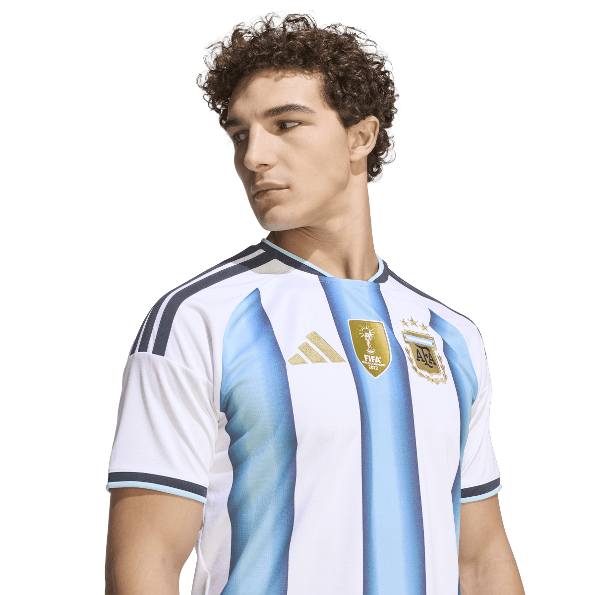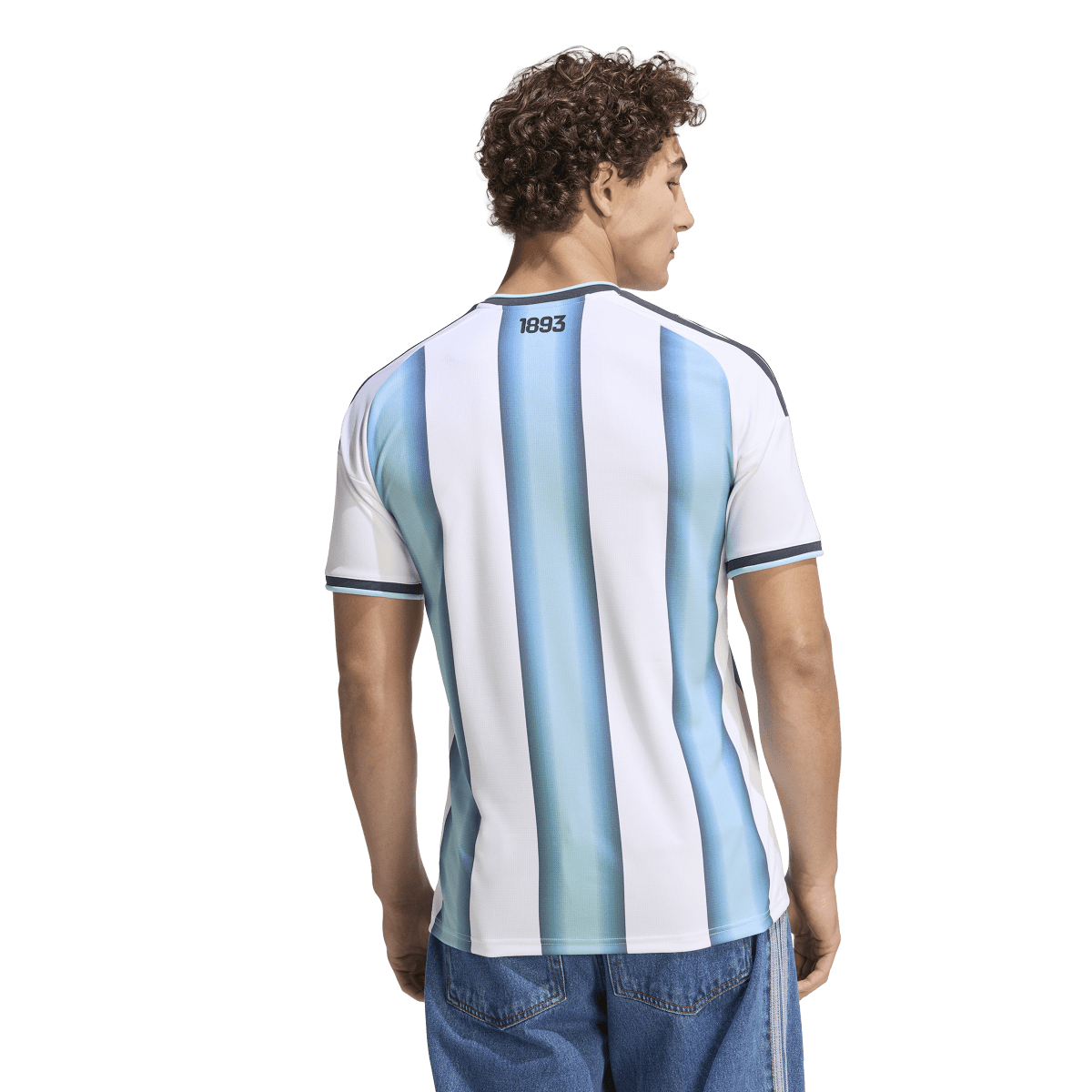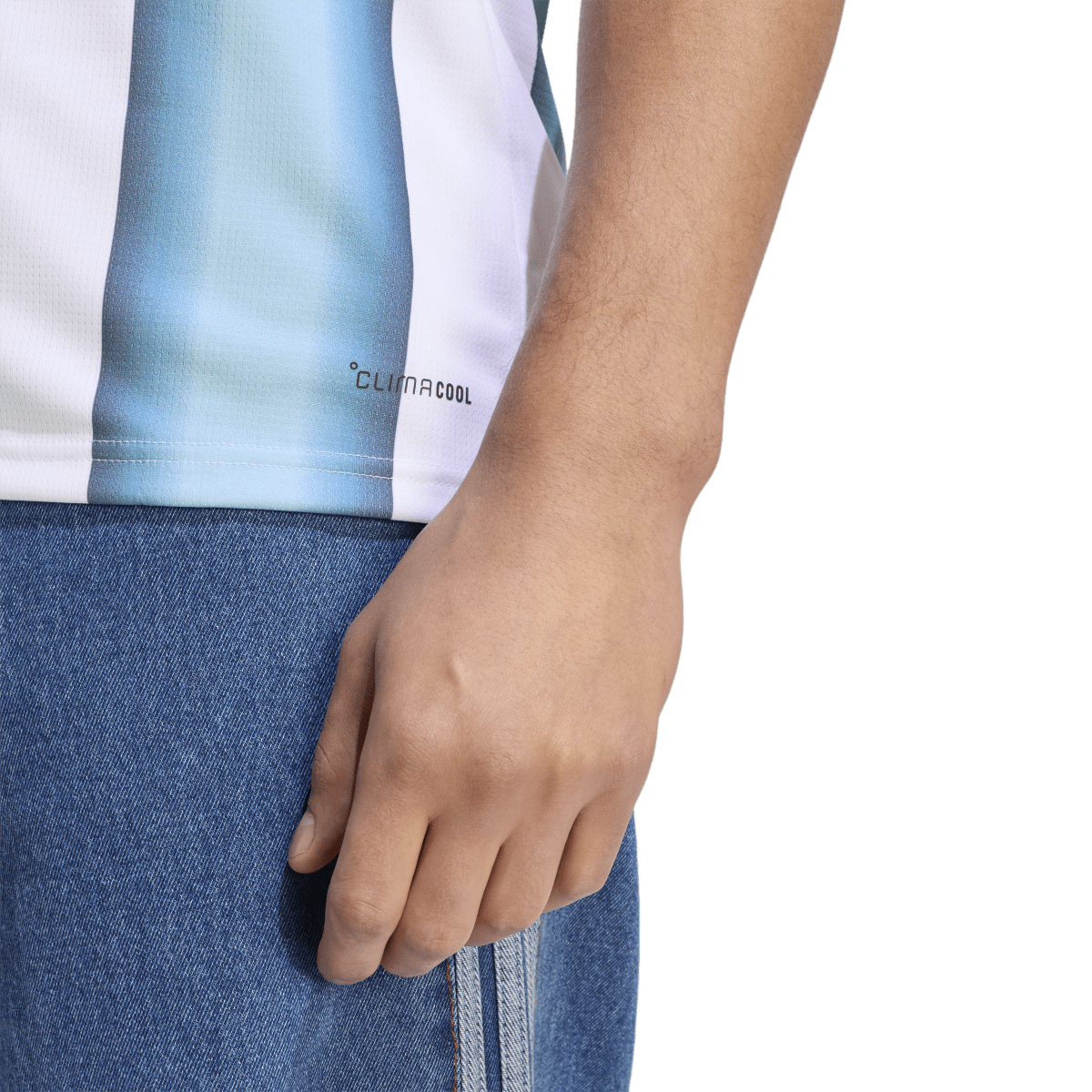 The Argentina 26 Home Jersey is more than just a jersey; it's a celebration of Argentina's soccer legacy. This kit is inspired by the jerseys worn during Argentina's three World Cup victories in '78, '86, and '22, and complemented by the federation's year of foundation as a proud sign-off. Cool. Dry. Ready. Climacool wicks and disperses sweat for a cool, dry and distraction free performance. The jersey's doubleknit construction offers durability and comfort, while its slim fit hugs the body, allowing for unrestricted movement on the pitch. Embrace the spirit of the World Champions with this jersey.