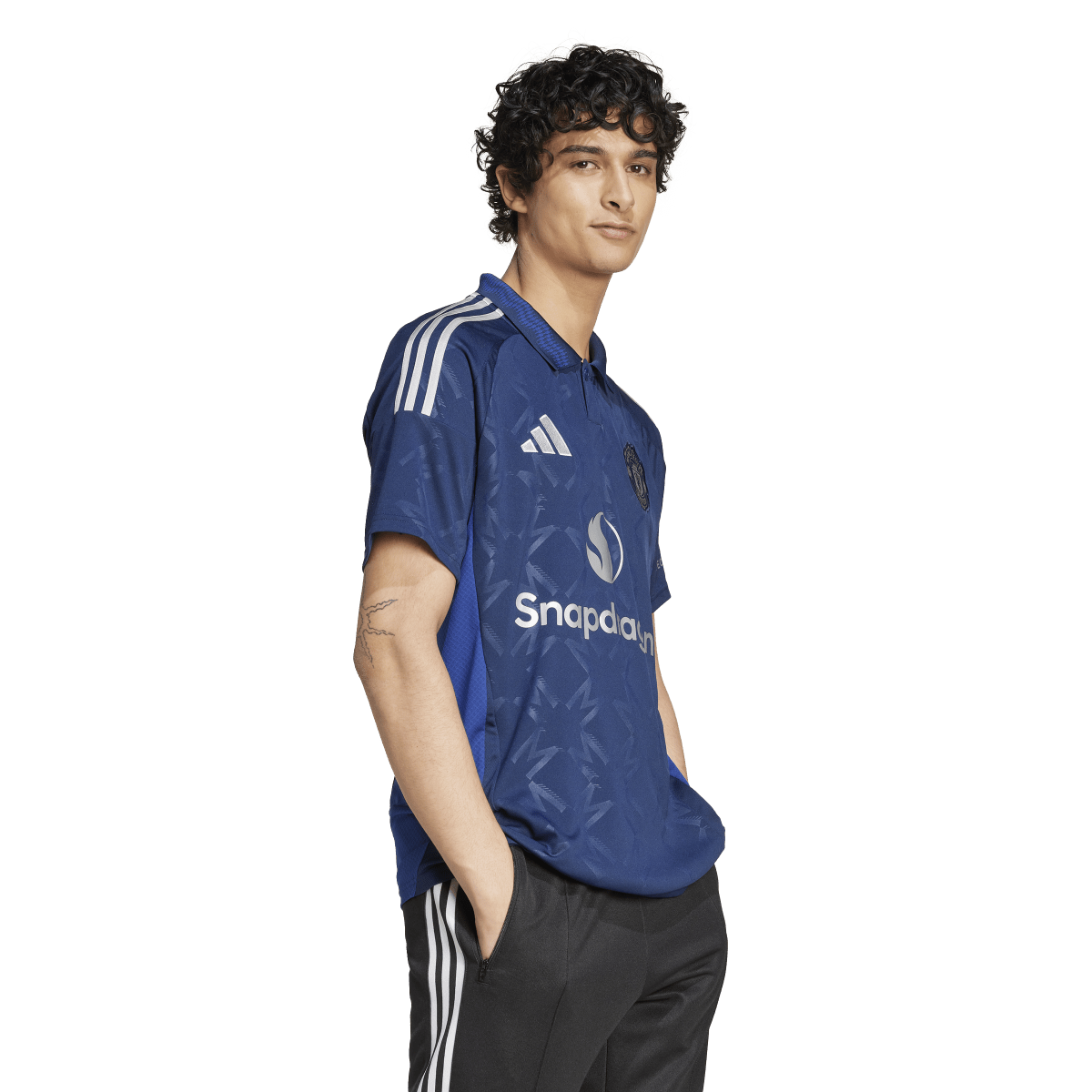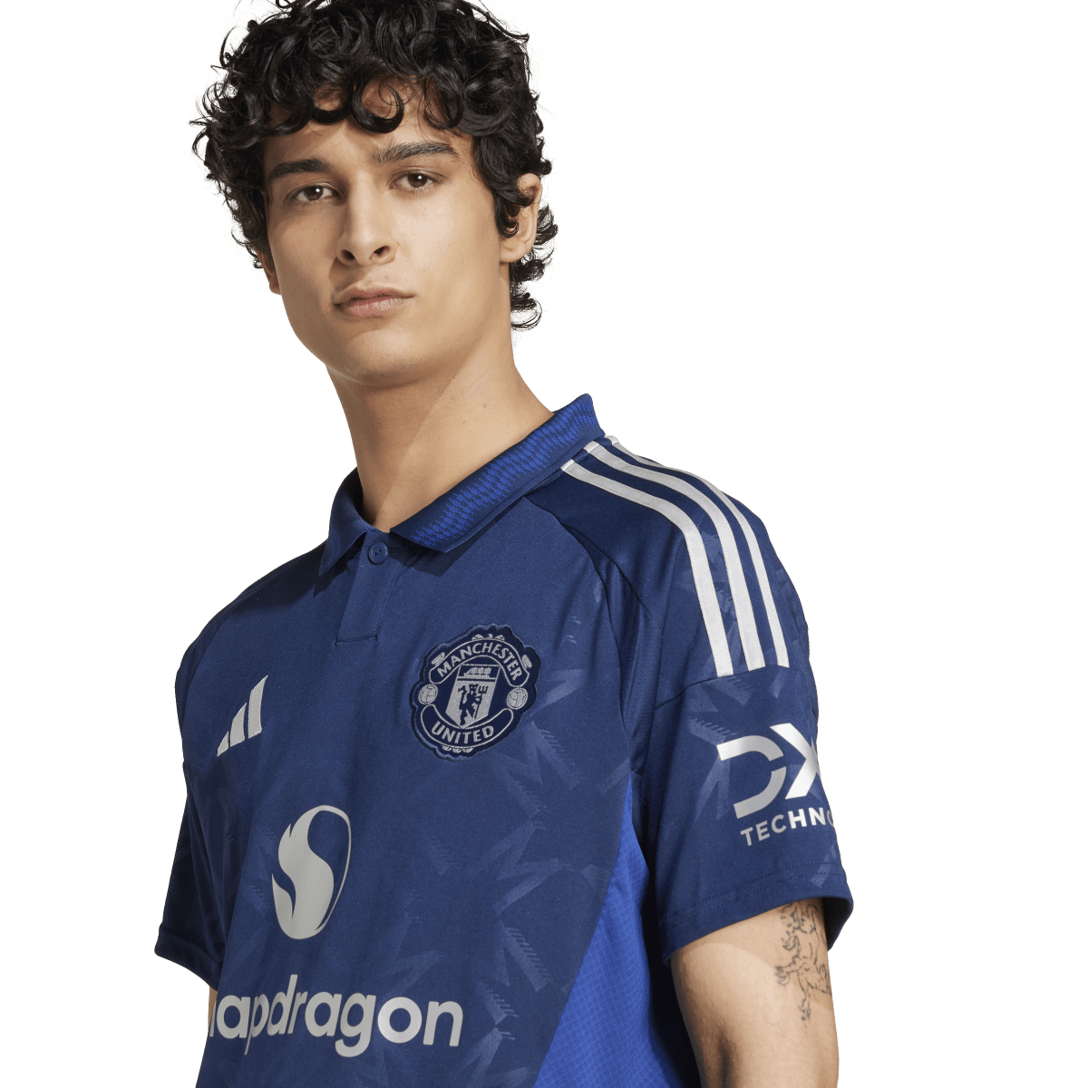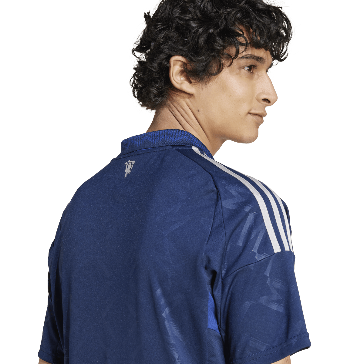 With a bold design that nods to football culture, this adidas Manchester United jersey looks equally at home on and off the pitch. Silver details pop against an indigo base that also includes a subtle, repeating "M" monogram. The light blue graphic on that stylish polo collar pays tribute to the river on which Old Trafford sits. Moisture-managing AEROREADY keeps fans comfortable on away days. This product is made with 100% recycled materials. By reusing materials that have already been created, we help to reduce waste and our reliance on finite resources and reduce the footprint of the products we make.