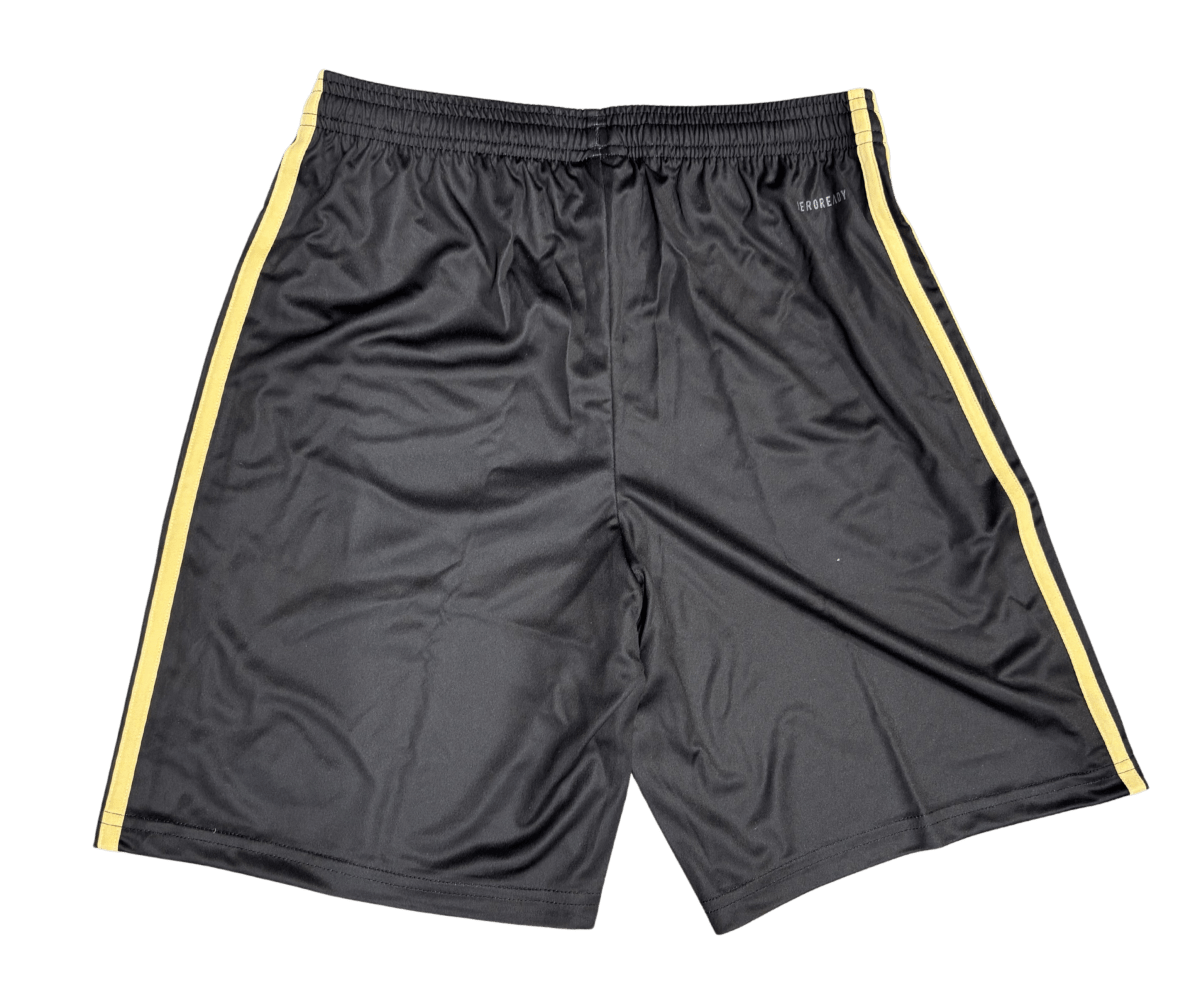 Custom made black Adidas shorts with gold colored three stripes on either side.
