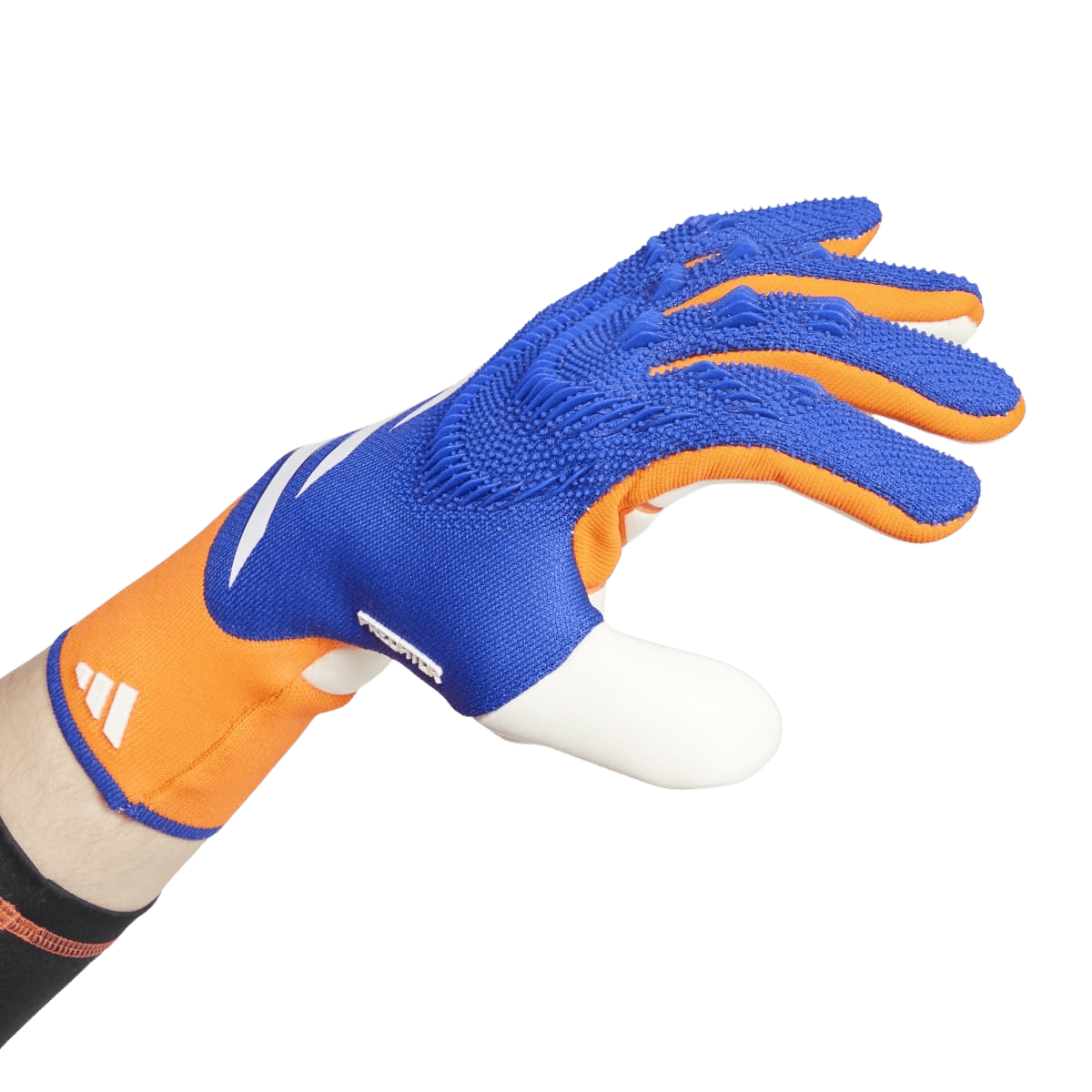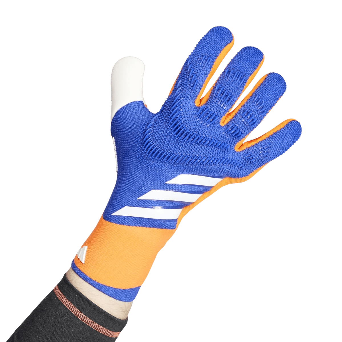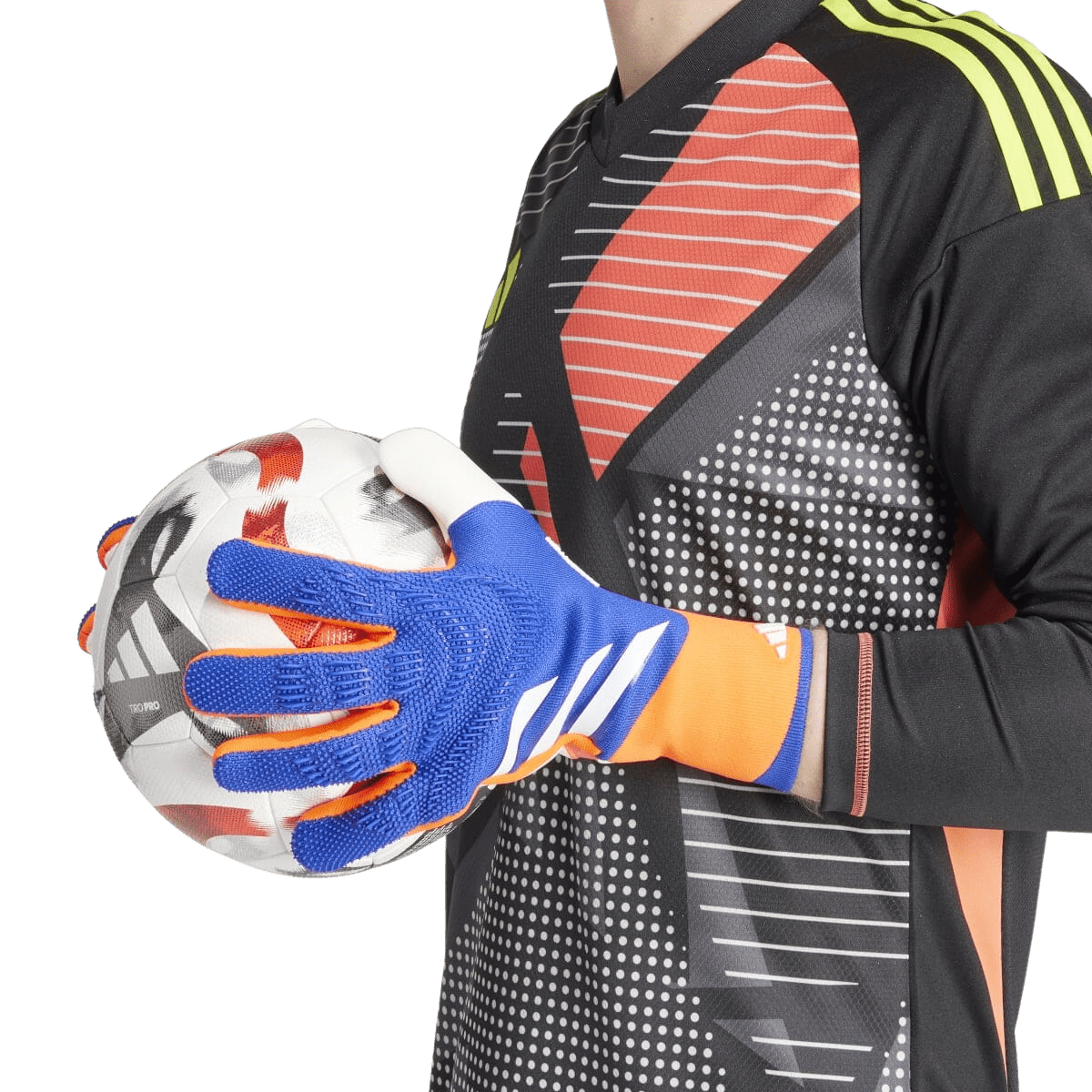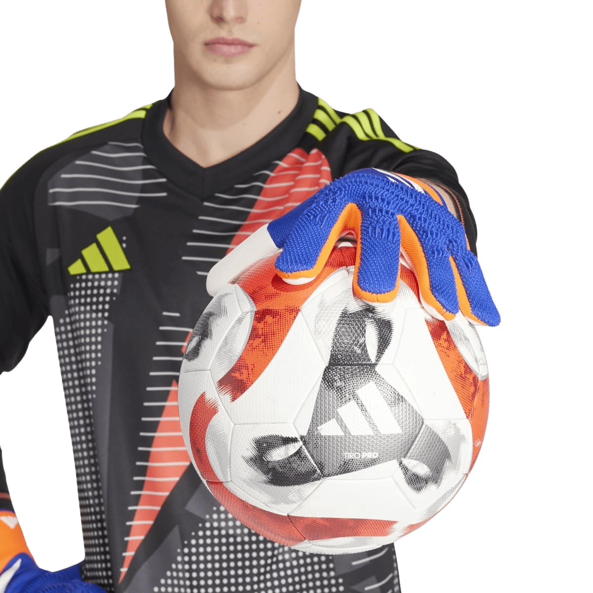 Boss your box in adidas goalkeeper gloves that keep your game on point. The strapless knit entry on these Predator Pro football gloves combines freedom of movement with rock-solid stability. Silicone elements on the flexible knit backhand deliver pinpoint punching. Grippy and cushioned, the URG 2.0 latex palm includes a thumb wrap for extra coverage.