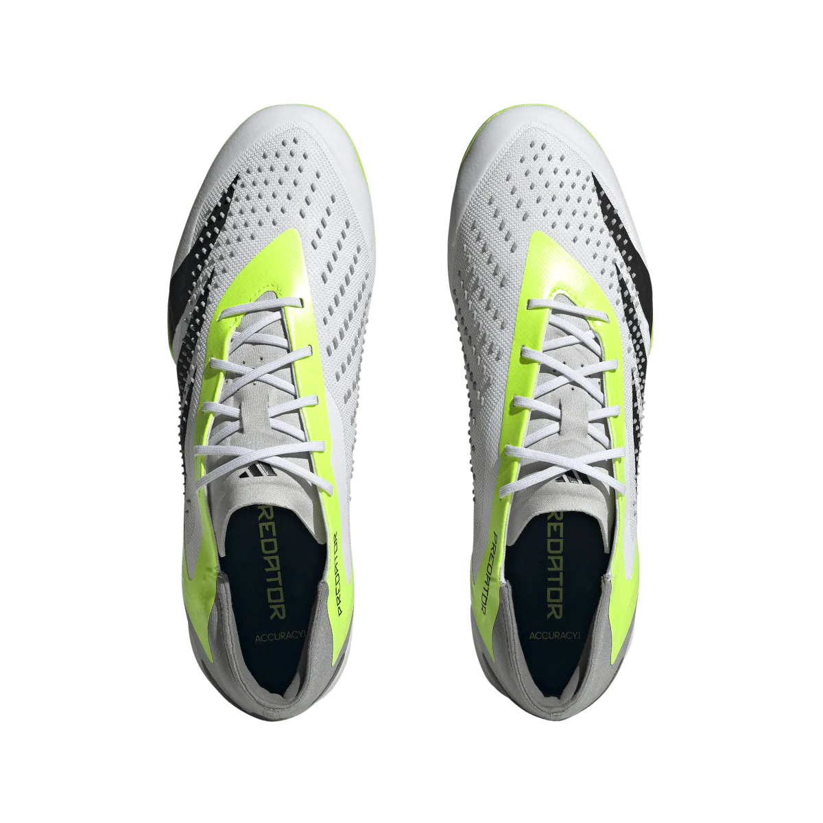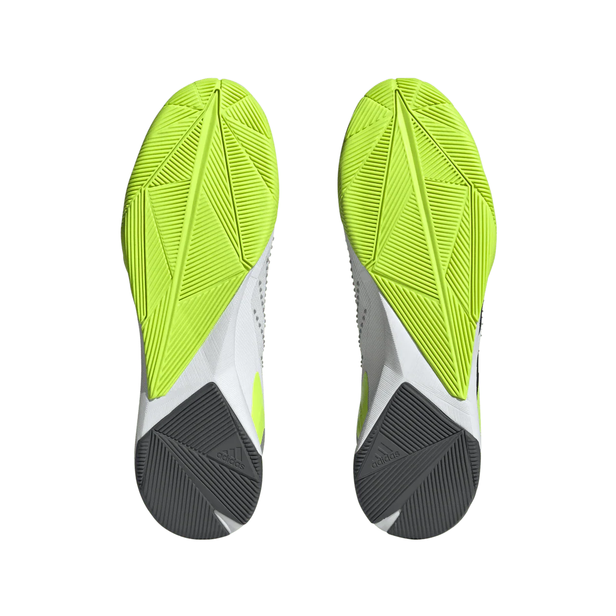 Top corner. Bottom corner. All the corners. adidas Predator Accuracy is crafted for goalscoring, so you know the ball will find the net. The fun's in choosing how it gets there. These soccer shoes have a soft mesh upper with High Definition Grip rubber elements that deliver biting grip on the ball without compromising forefoot flexibility. A Bounce midsole and non-marking rubber outsole keep you comfortable and stable on flat indoor surfaces. Made with a series of recycled materials, this upper features at least 50% recycled content. This product represents just one of our solutions to help end plastic waste.