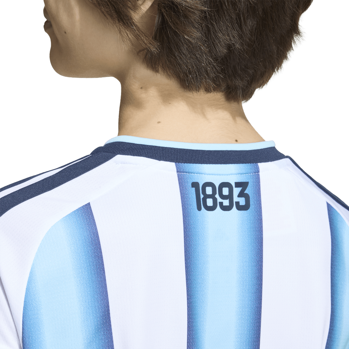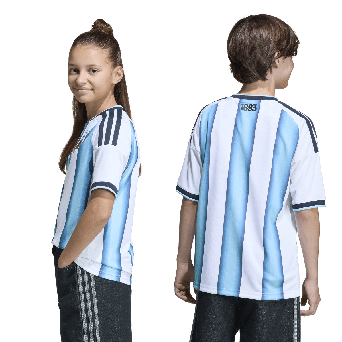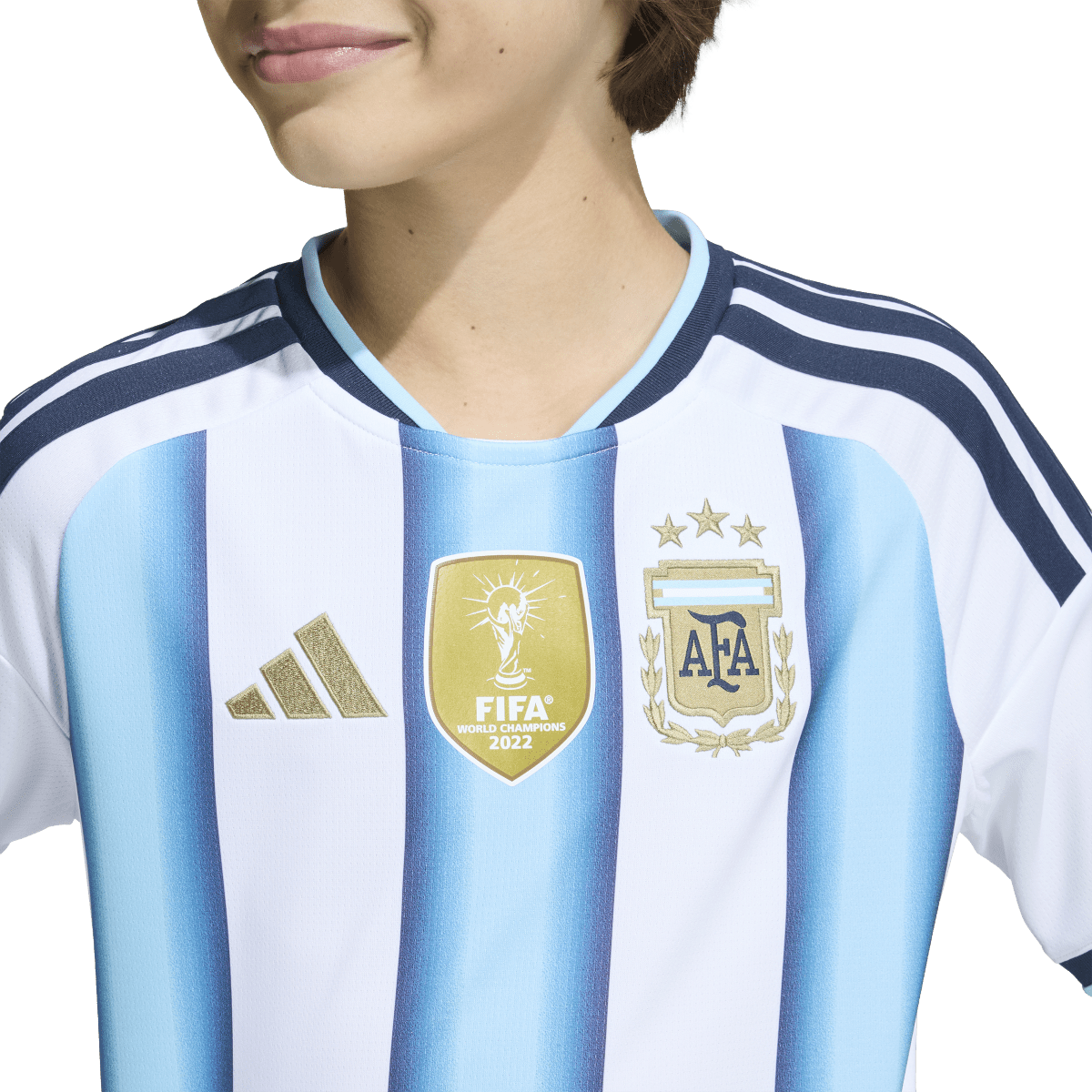 The Argentina 26 Home jersey is a tribute to soccer's legacy and future triumphs. Made for young fans, it captures the pride of a nation. Inspired by historic kits worn during Argentina's greatest victories, it blends heritage with bold intent. Designed with adidas Climacool breathable materials to aid cooling for optimal comfort. Bold 3-Stripes and a seasonal collar bring a modern edge, while the sewn-on team crest signals unwavering support. For young fans, it's more than a jersey. It is a symbol of dreams in motion.