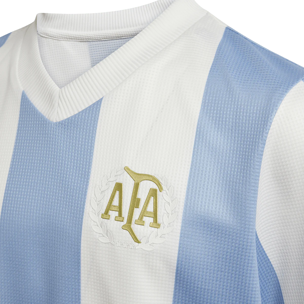 An Argentina jersey that marks a winning partnership, made with recycled materials. Part of a special kit that marks the 50th anniversary of Argentina and adidas first joining forces. This football jersey rolls back the years with an iconic Trefoil and mid-'70s-inspired team crest standing out in gold colours over those famous stripes. Moisture-managing AEROREADY will keep you focused on the action, while a special sign-off captures the feeling of supporting Argentina.