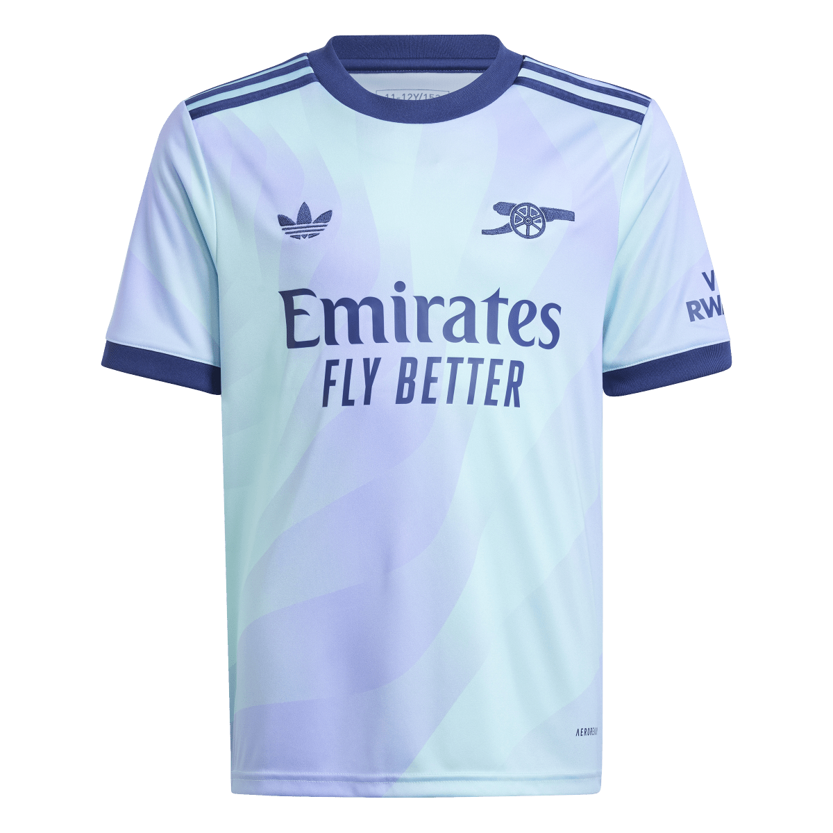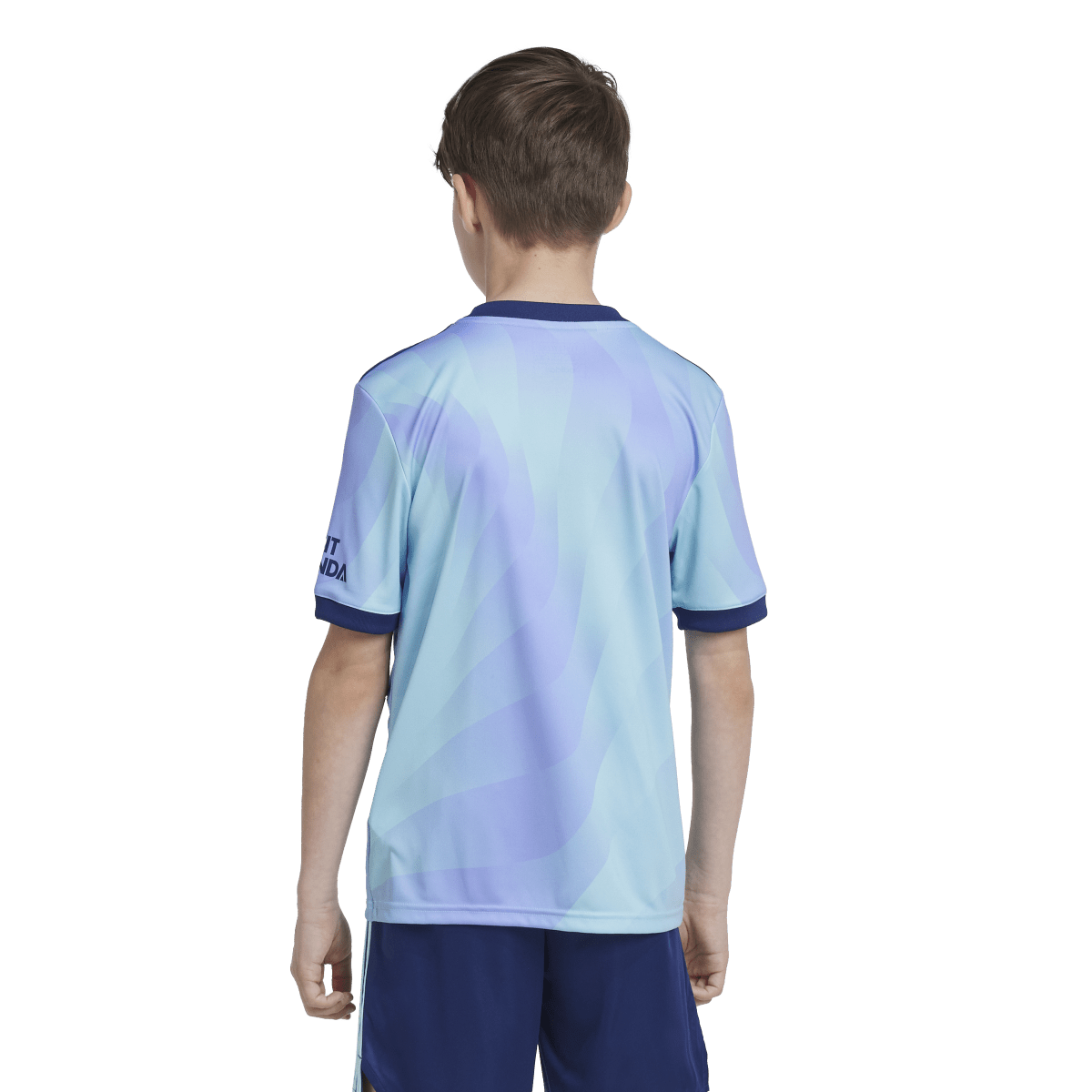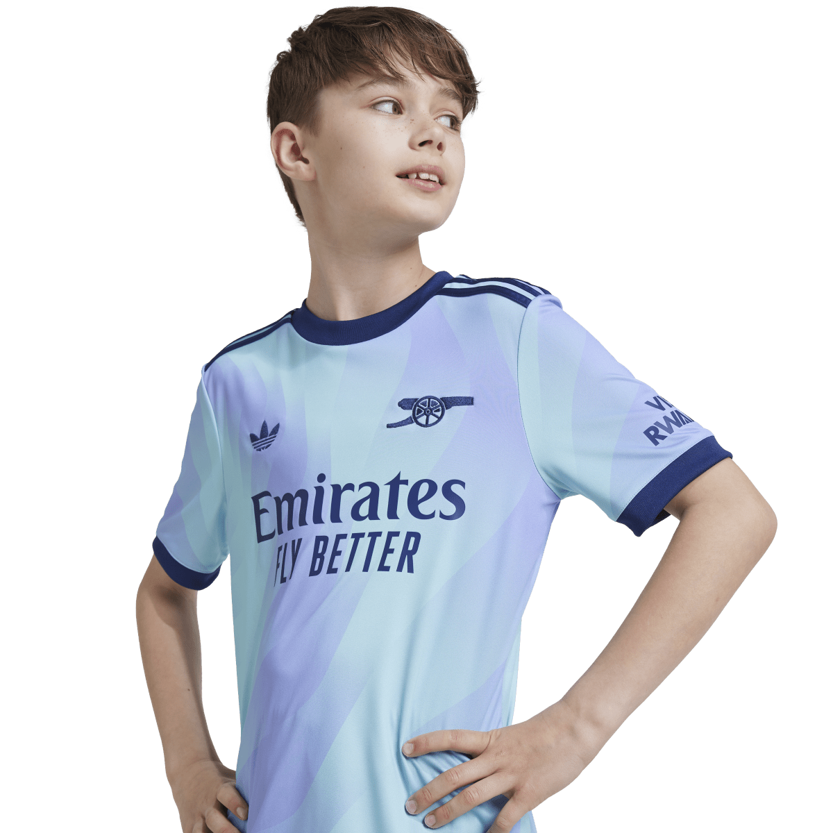 A fresh take on football heritage. Standing out in lilac and aqua, this juniors' Arsenal third jersey pairs a bold cannon badge with an iconic adidas Trefoil. The result? A vibrant look that will add colour to dressing rooms, away ends and post-game celebrations. Wherever you wear it, soft interlock fabric and moisture-managing AEROREADY ensure you feel ready for anything. This product is made with 100% recycled materials. By reusing materials that have already been created, we help to reduce waste and our reliance on finite resources and reduce the footprint of the products we make.