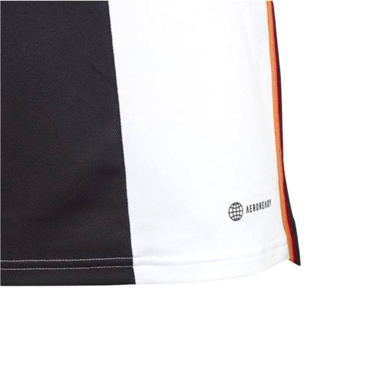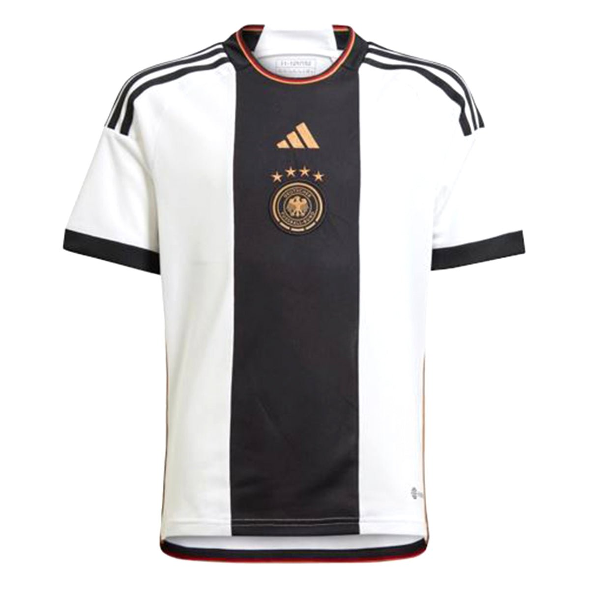 A look to set pulses racing. Placed over the heart and detailed in gold, a woven team badge takes center stage on this adidas juniors Germany soccer jersey. A change of direction for modern home shirts, that bold vertical stripe is filled with national team DNA. Mesh panels and moisture-wicking AEROREADY team up to keep fans comfortable. Made with 100% recycled materials, this product represents just one of our solutions to help end plastic waste