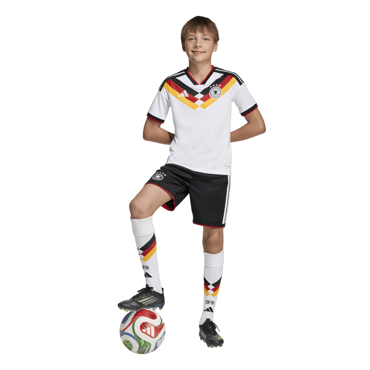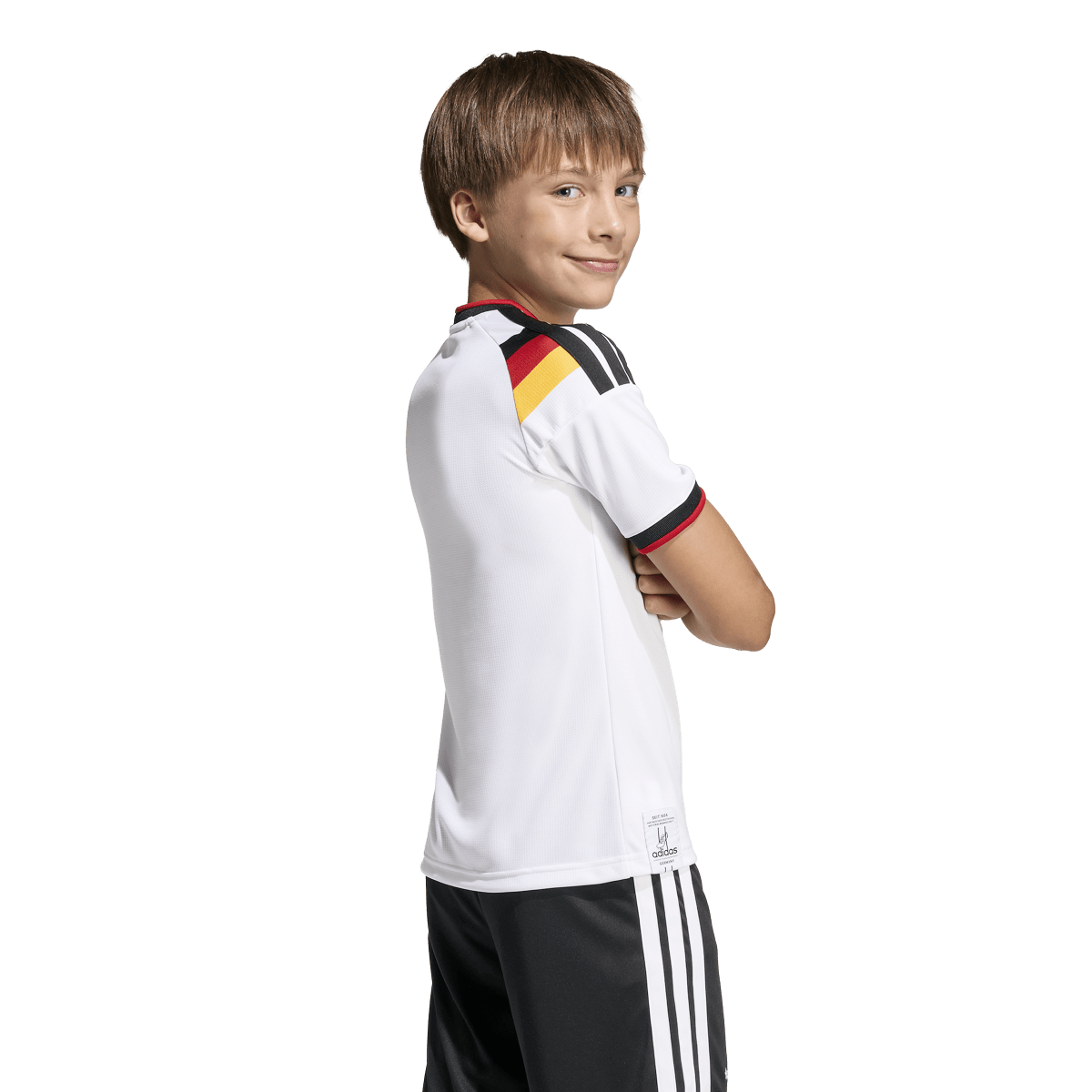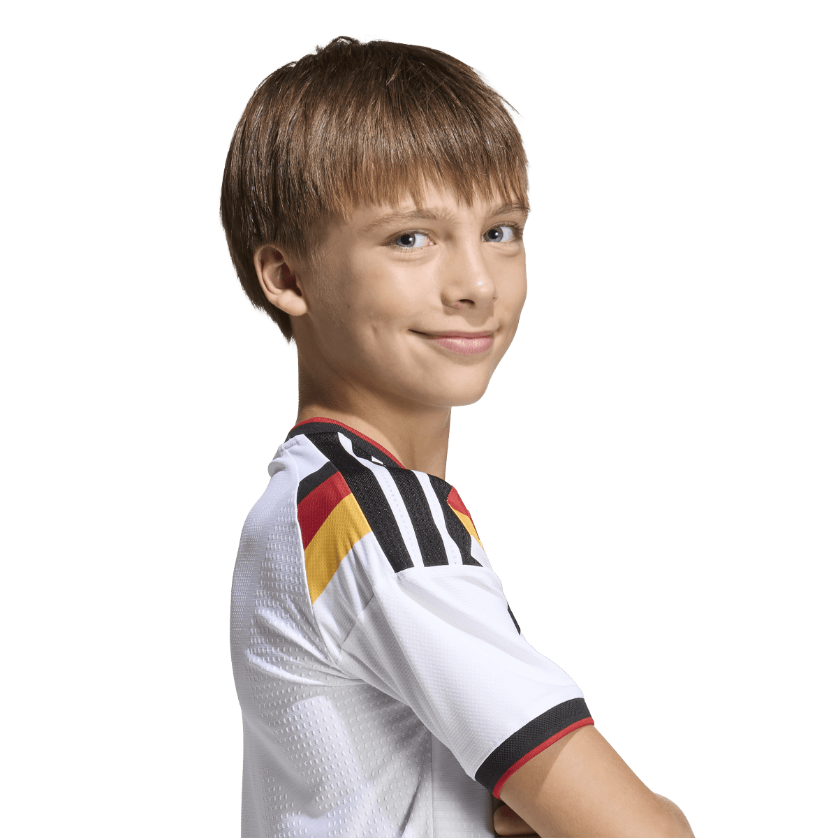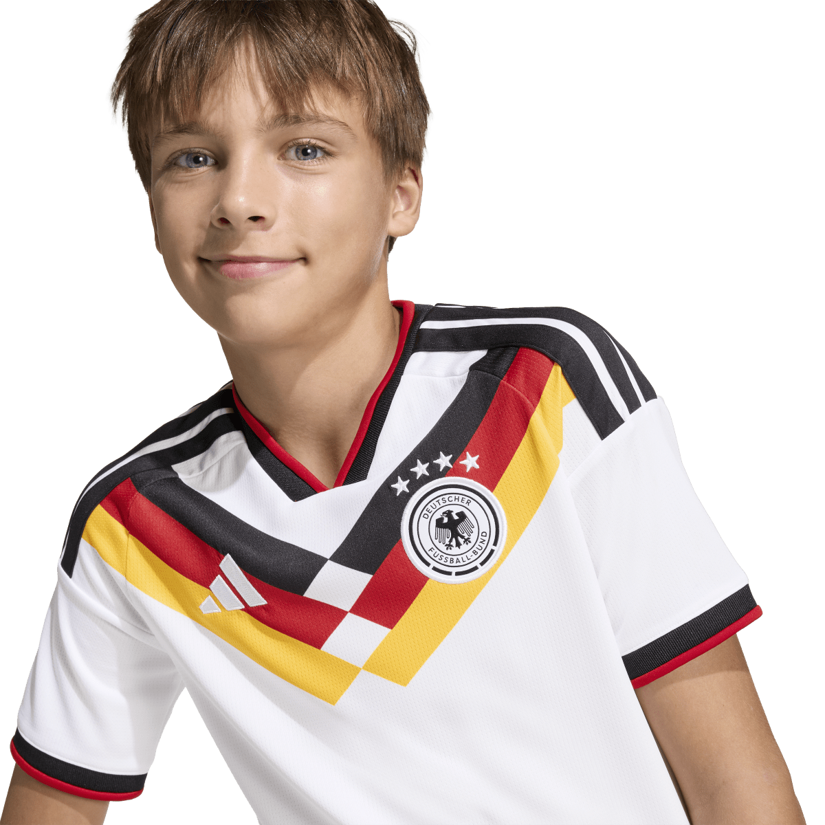 The Germany 26 Home Jersey is designed for young soccer enthusiasts who dream of emulating their heroes on the pitch. This jersey combines the essence of iconic moments with cutting-edge tech so they can stand out in both style and performance. Integrated Climacool fabric technology wicks and disperses sweat for a cool, dry and distraction-free performance while a regular fit offers freedom of movement, so they can feel focused and ready during intense matches. The jersey's doubleknit construction meanwhile offers durability and a soft feel against the skin, making the top a great choice for everyday wear. and with the adidas logo and club crest proudly displayed, your child will feel like part of the team. Let your child feel the excitement of the game with this jersey, where tradition and heritage meet innovation. It's more than just clothing. It's a way of life.