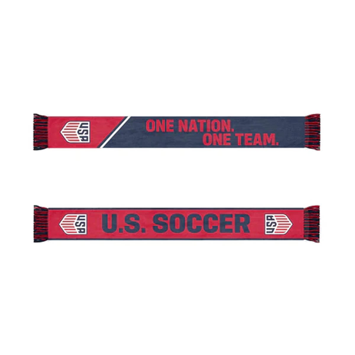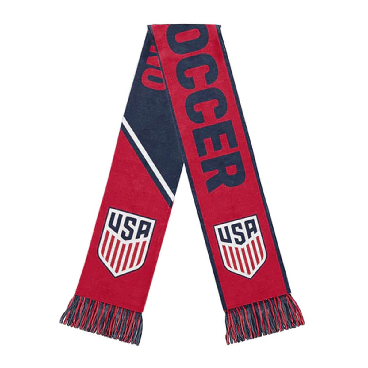 Whether you are staying warm or looking cool, fly your fandom of the greatest football team in the world when you raise your official licensed US Soccer reversible fan scarf. Features the iconic club logo and name in woven acrylic in traditional red and blue US Soccer colors inverted on each side. Dimensions: 58" x 6.5"