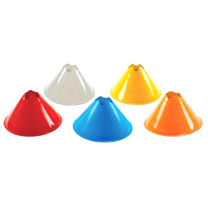 The 6A13 Jumbo Disc Cones are available in five colors. The 6A13 Jumbo Disc Cones include a molded cradle at the top, allowing the Jumbo Disc Cones to be used as hurdles (sticks sold separately). The 6A13 Jumbo Disc Cones are sold in dozens by color.