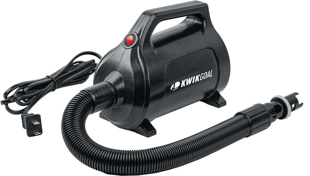 The Kwik Goal 1A606 Electric Air TOM Pump is a compact, high-performance electric pump designed for quick and efficient inflation and deflation of the Air TOM line, including the Air TOM BFM, Air TOM AFM, and Air TOM. Powered by a 600W motor and operating on AC 110–120V, it delivers up to 2.5 PSI of air pressure for reliable performance during setup and takedown. The pump includes a flexible 15”–36” hose and four detachable nozzles, one of which is compatible with Bravo air valves, providing versatility across multiple applications. Weighing just 2.5 lbs and measuring 6” × 4” × 5”, it’s lightweight, portable, and ideal for efficient field use. (Not suitable for inflating soccer balls.)
